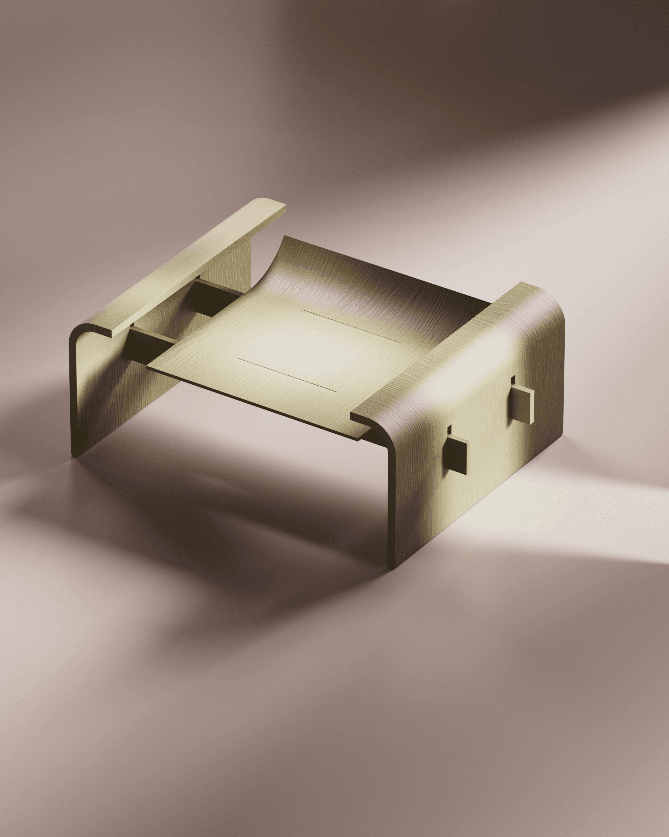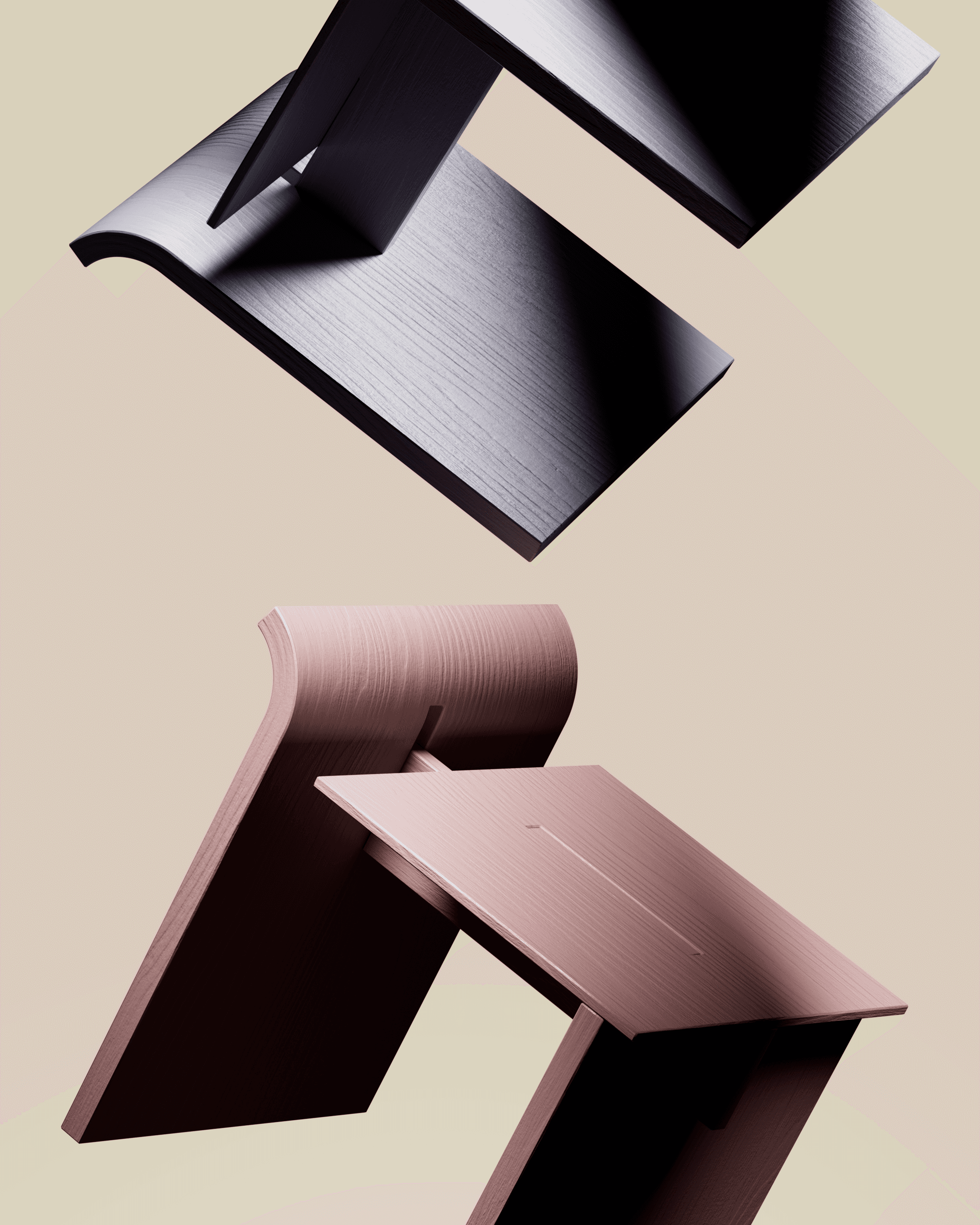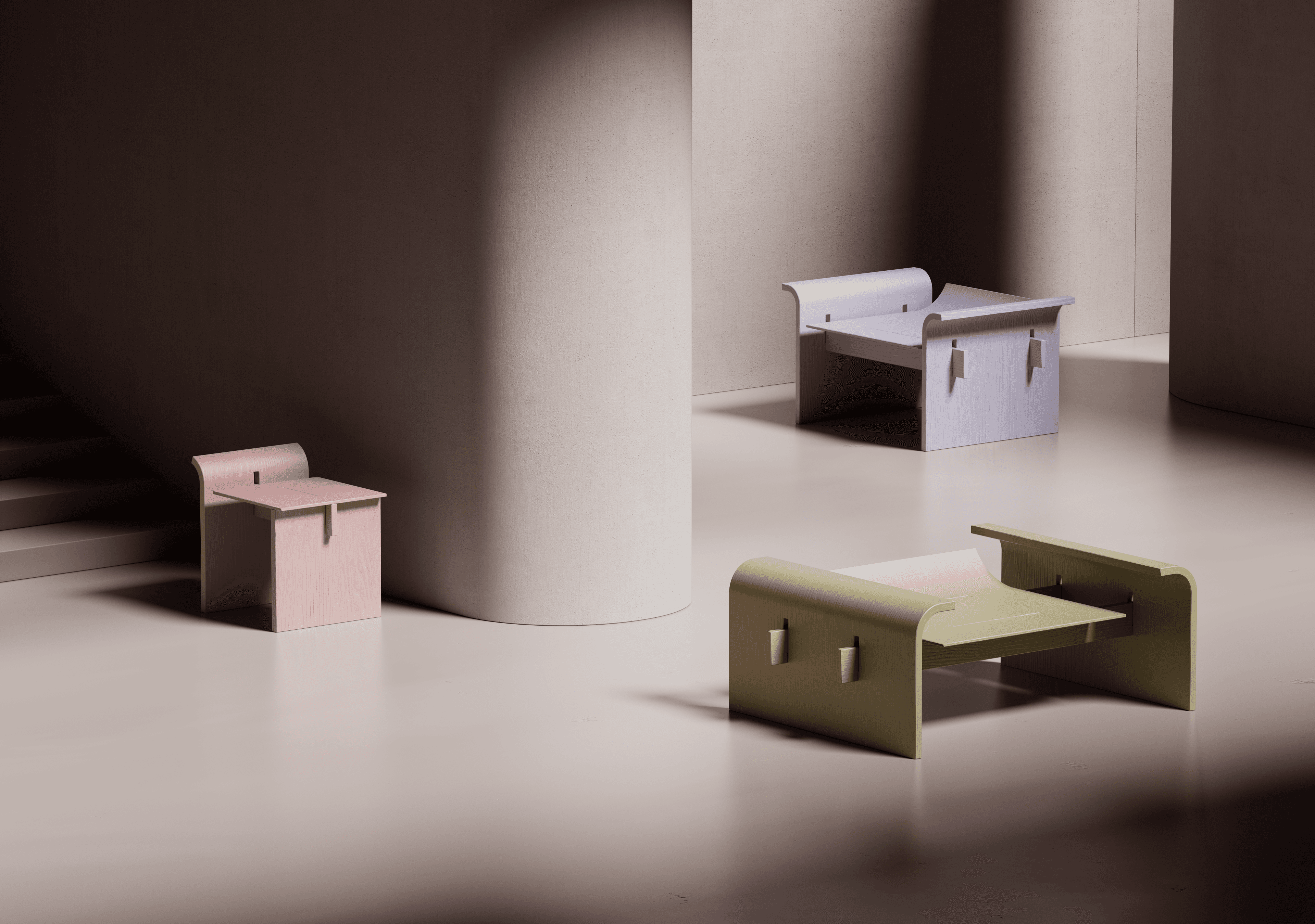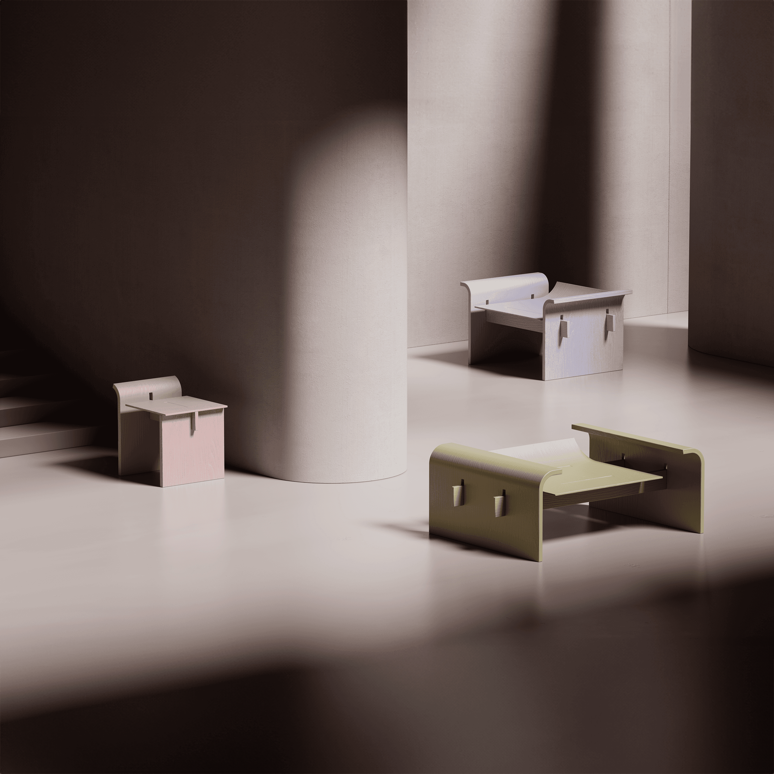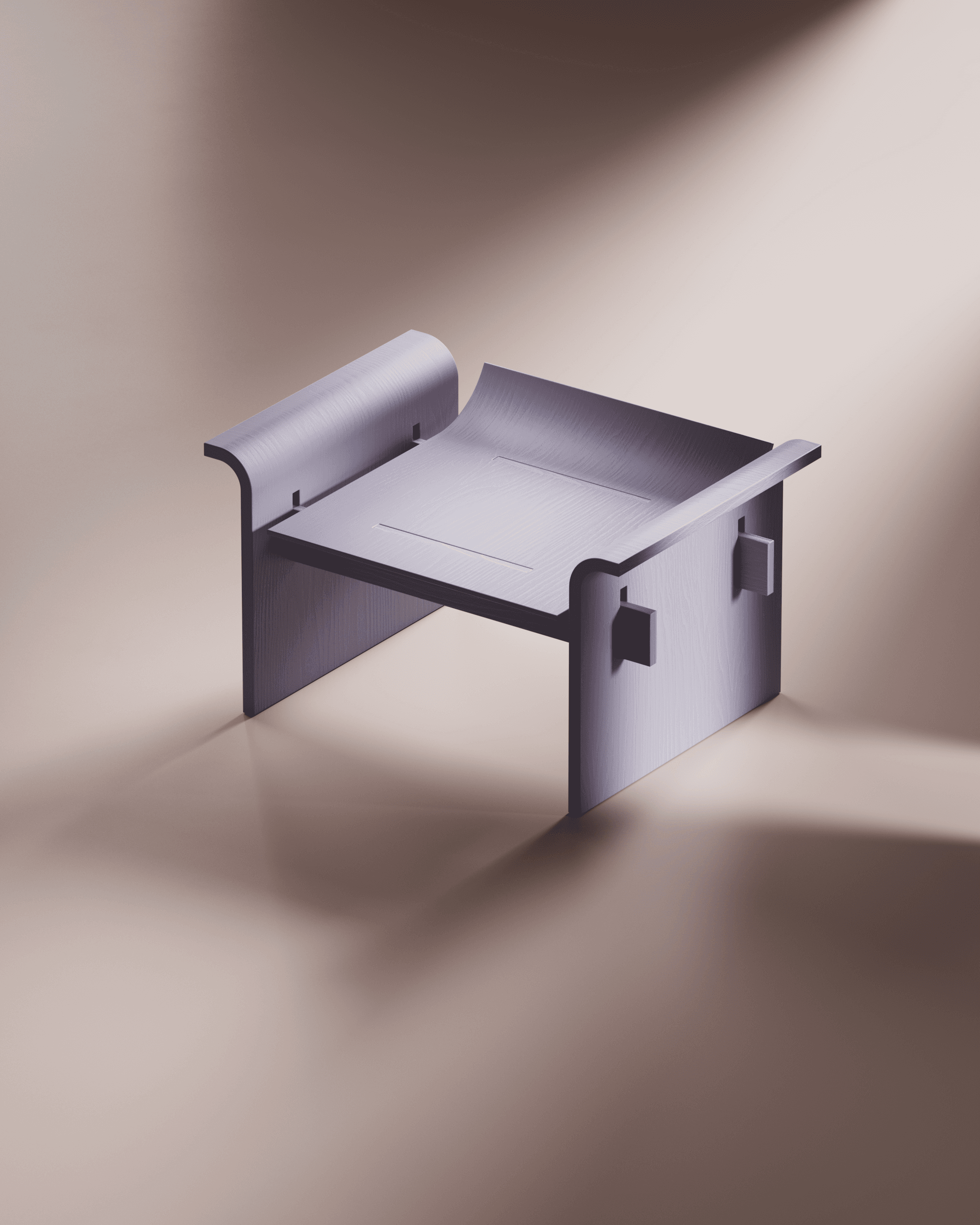 In 2022, I developed my first furniture collection, Dobra. The series includes a stool, a chair, and a lounge chair, all defined by a shared language of subtly bent angles. Although the collection remained digital, each piece was designed with real-world construction in mind - the structural details were carefully considered to ensure the furniture could be built beyond the virtual space.